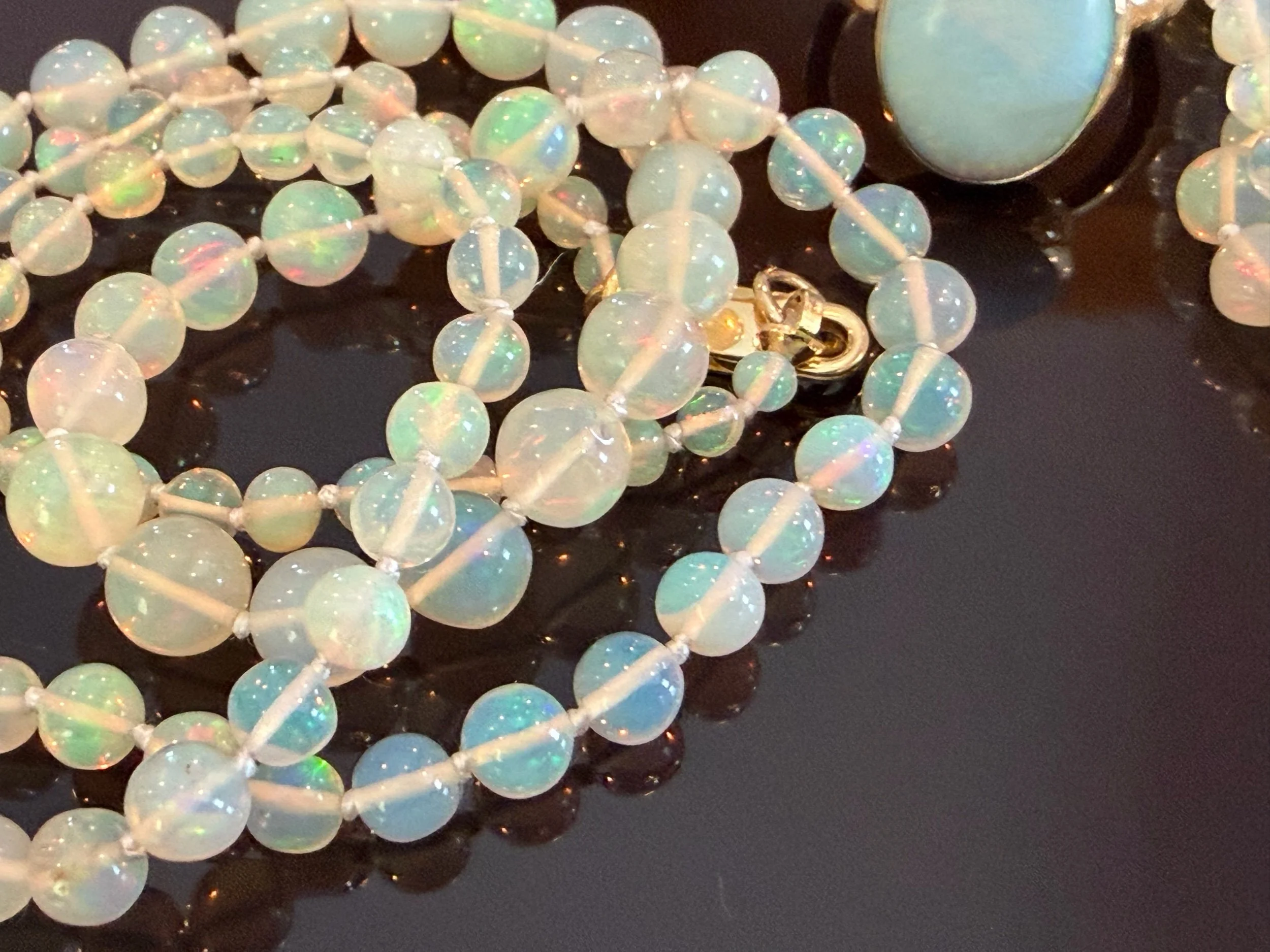 Opal Strand Necklace, approximately 18 inches, slightly graduated + hand strung on white silk cord. 14k yellow gold clasp. The perfect size as a stand alone piece or layered.