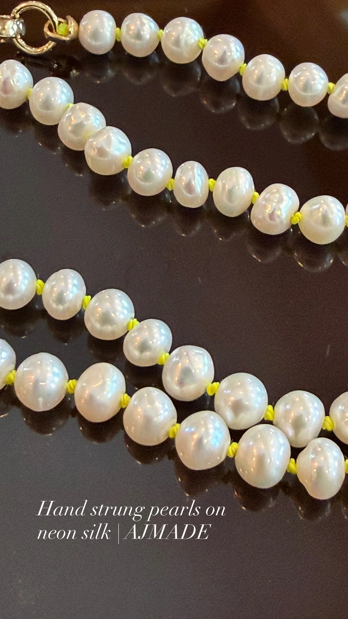 Pearl strand necklace, 18 inches, hand strung on neon yellow silk cord. 14k solid yellow gold lobster toggle clasp. 5.5MM FW glistening pearls — perfect size and length as a stand alone piece or layering.